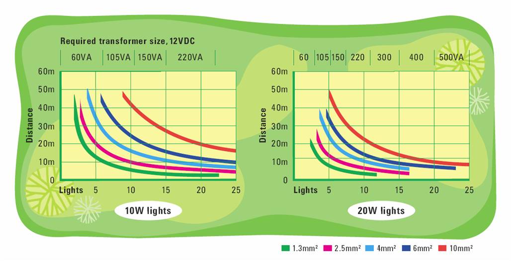 Making garden wiring simple and economical. Gardolex is a robust PVC sheathed extra low voltage power cable for projects of all sizes. The construction has been specifically engineered for outdoor AC/DC lighting applications with a durable, water resistant PVC sheath and is available in six conductor sizes depending on the number of lights, wattage and cable length you require. The graphs will help you find the cable and transformer rating that's appropriate for your project. If unsure, ask your consultant or reseller for advice.