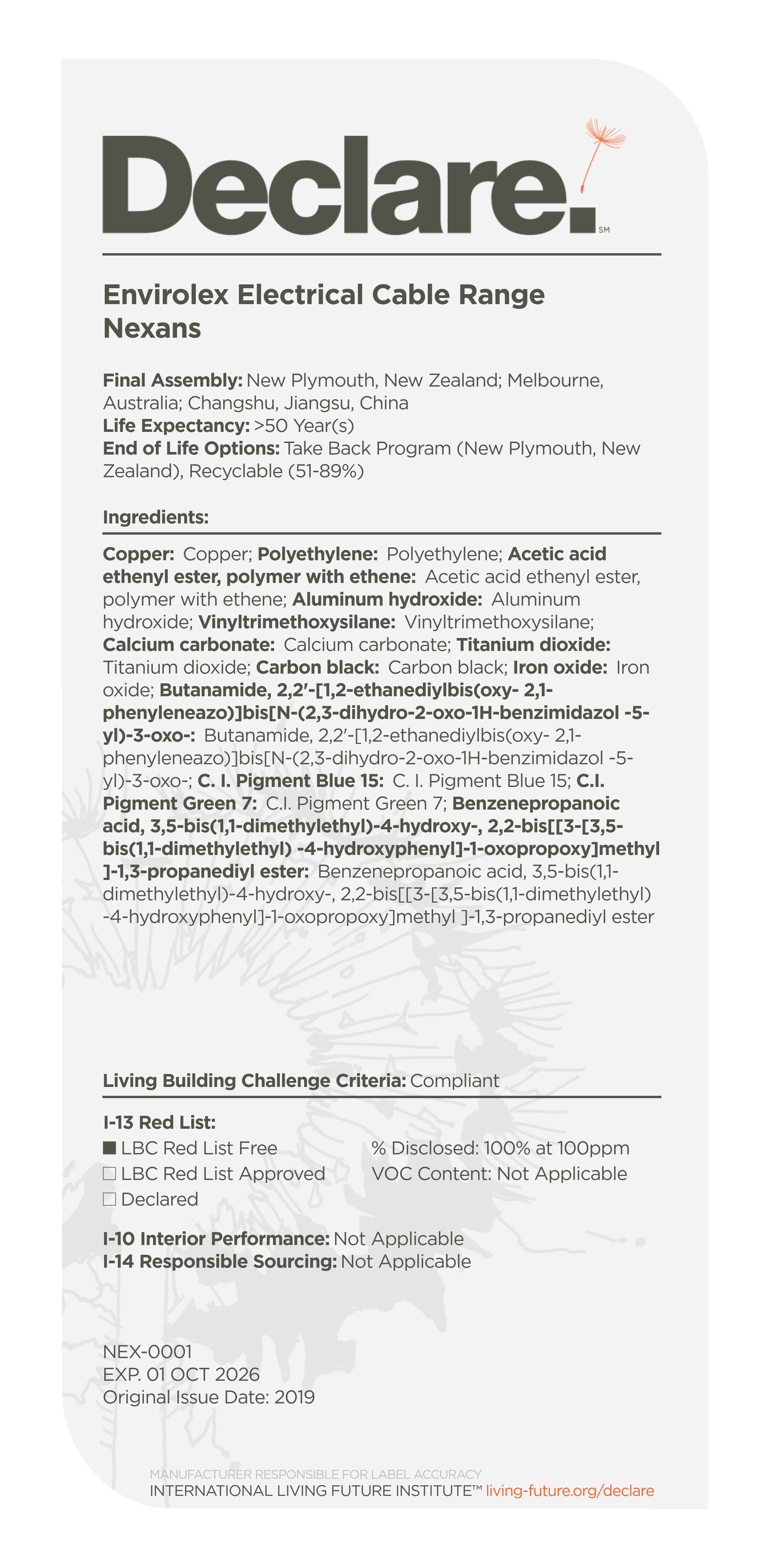 Nexans Fire Safety Offer ENVIROLEX® Flat, Low Fire Hazard Cables PVC-free Red List Free and Declare Labelled Green Star