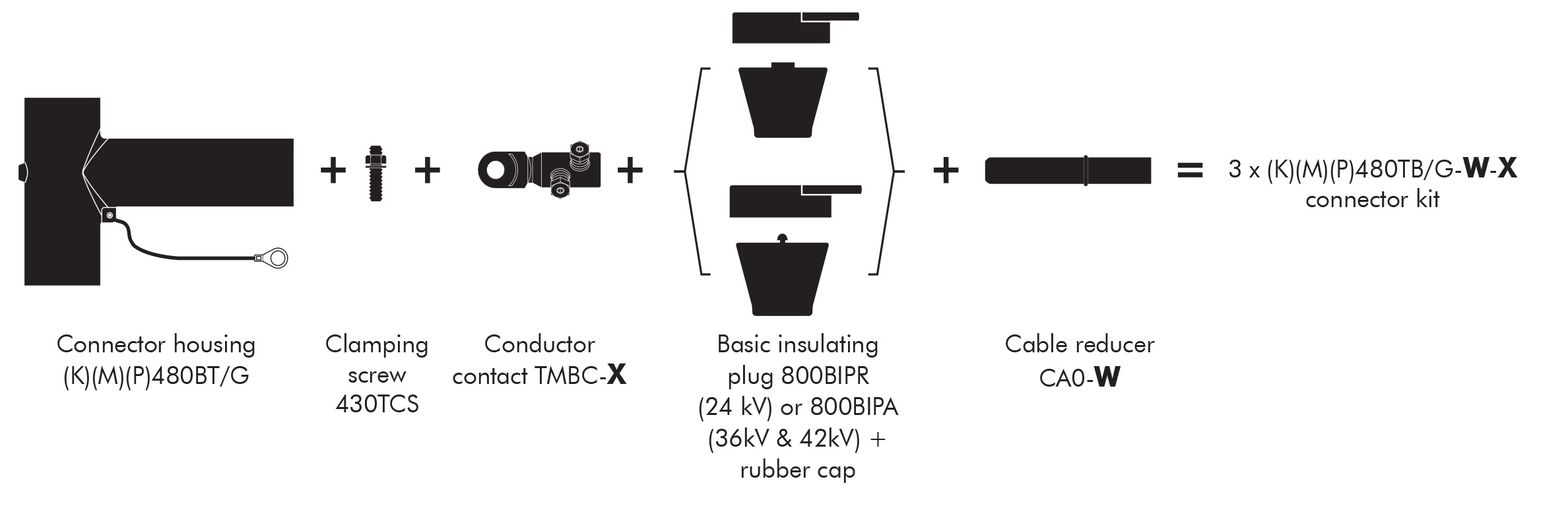 - (K) / (M) / (P) correspond respectively to connectors compatible for 24 kV / 36 kV / 42 kV voltages.