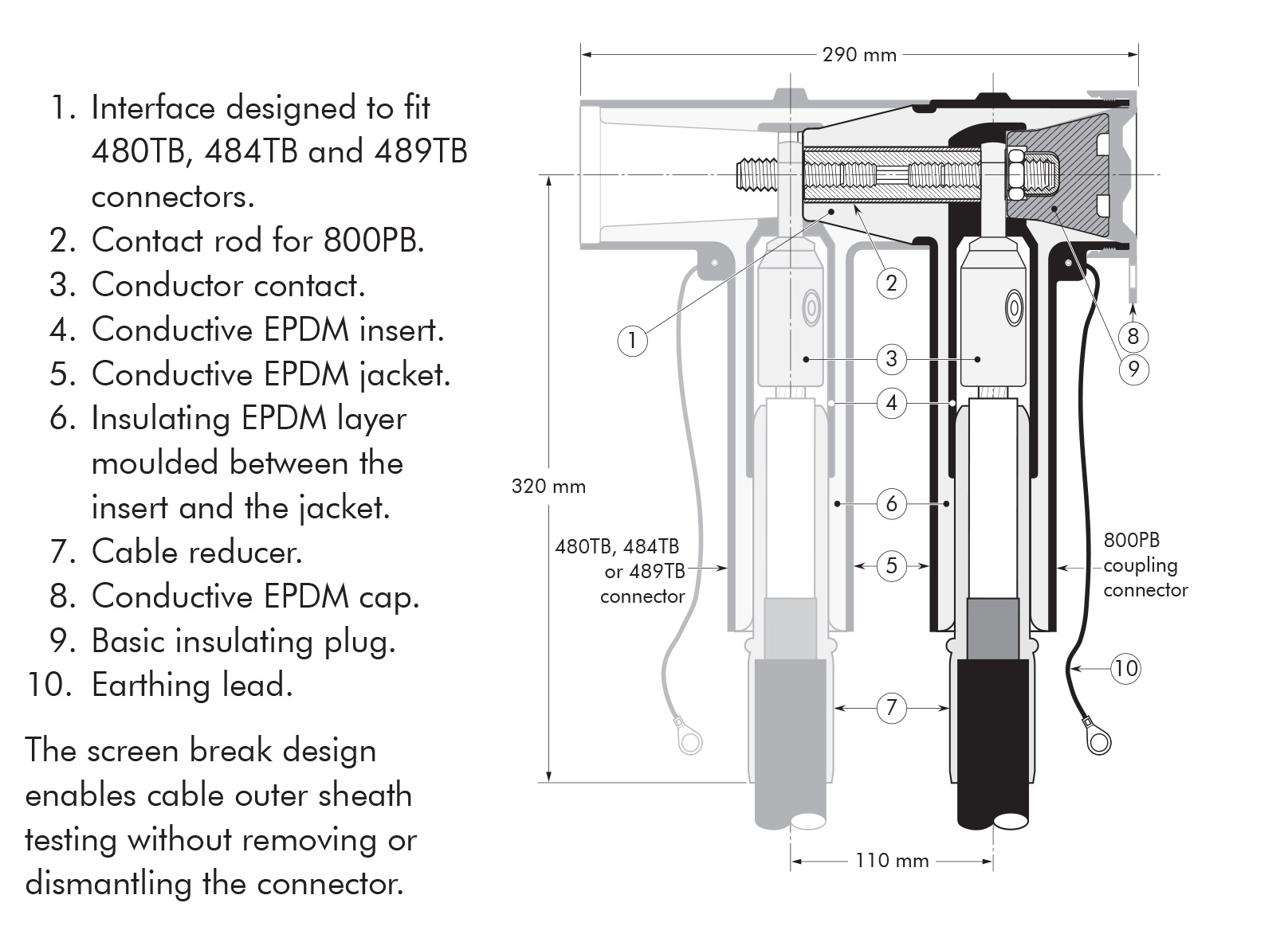 - A thick conductive EPDM jacket provides a total safe to touch screen which ensures safety for personnel.