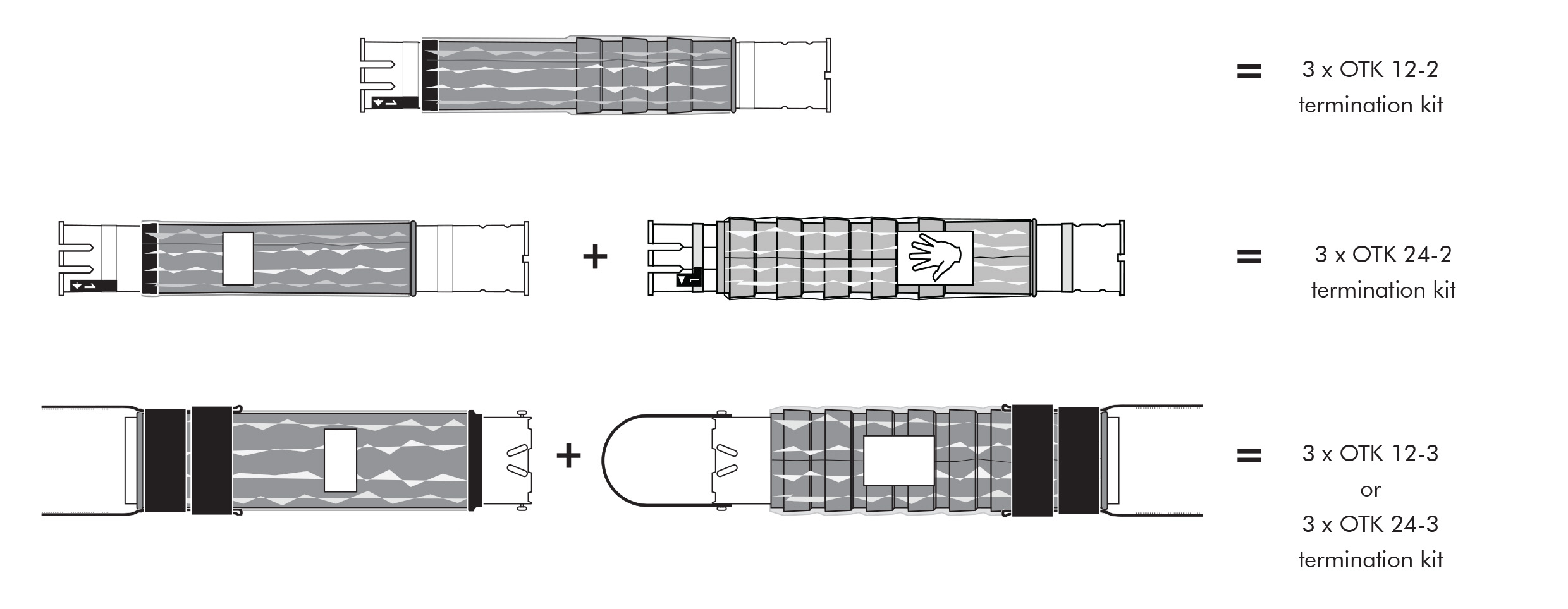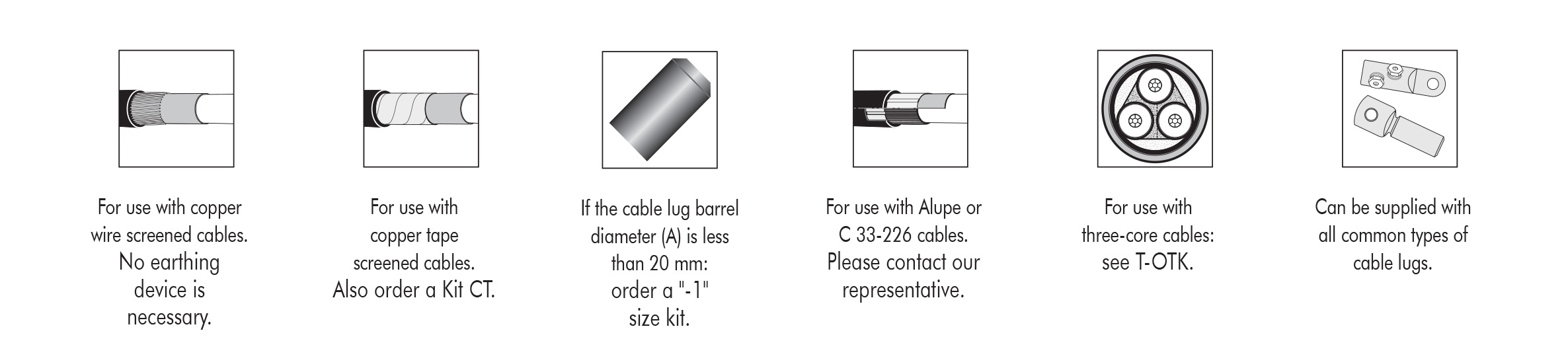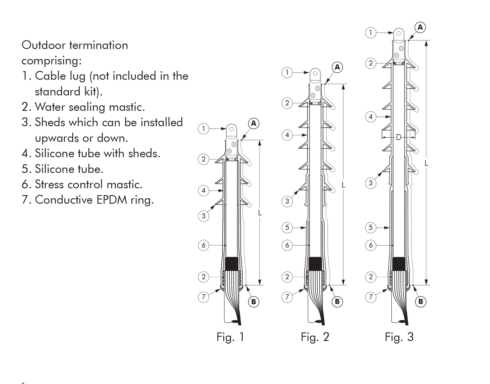 A kit of 3 terminations for use outdoors and exposed to prolonged sunshine and other weather conditions. Used to connect polymeric insulated cable to equipment and for the outdoor terminating on to overhead lines or busbars.